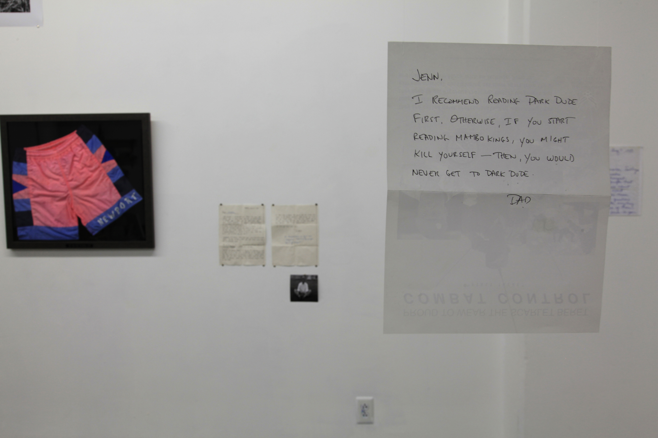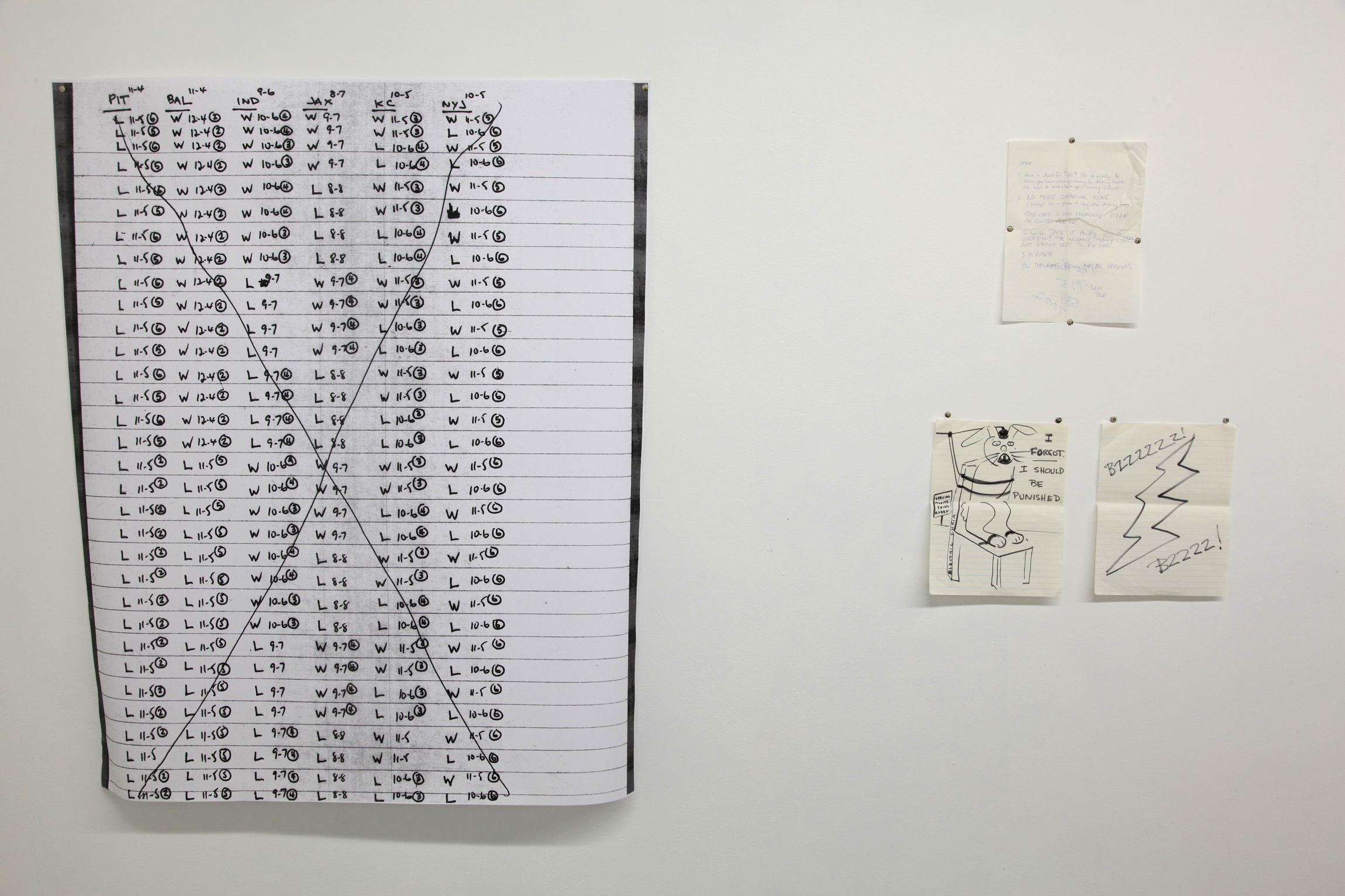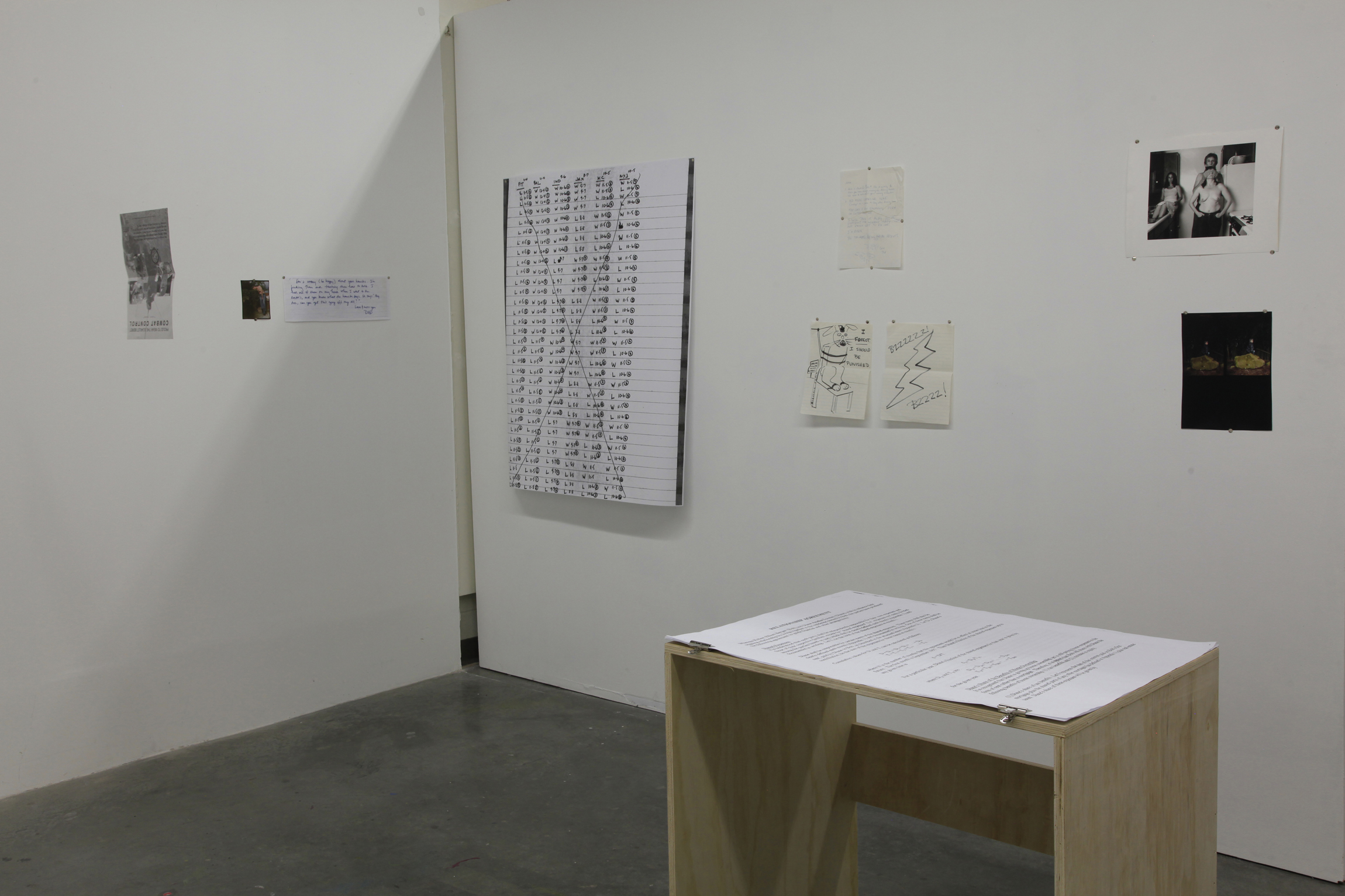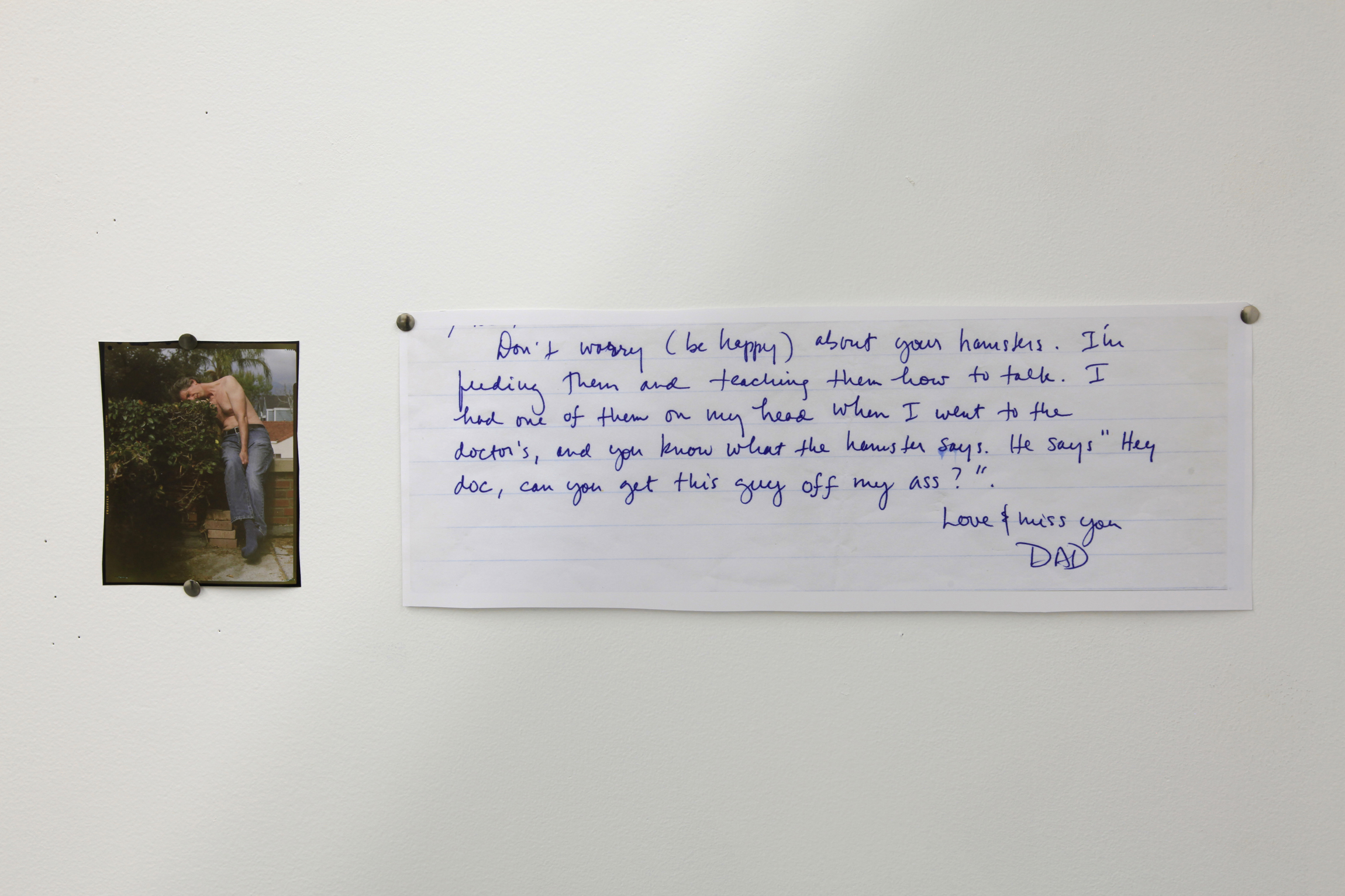 I’m Glad My Dad Is Tall (I’M NOT REALLY TALL; IT’S RELATIVE) is a collection of correspondence, images, and videos exhibiting a relationship between the artist and her father. Alongside staged photos and videos, the inclusion of father-to-daughter letters acknowledges correspondence as an intimate form of performance. Likewise, the conversation between the father’s materials (letters, charts, contracts) and the daughter’s designated artworks (drawings, staged photographs and videos) considers the parameters that determine a work of art, as well as documentary versus fictional accounts.