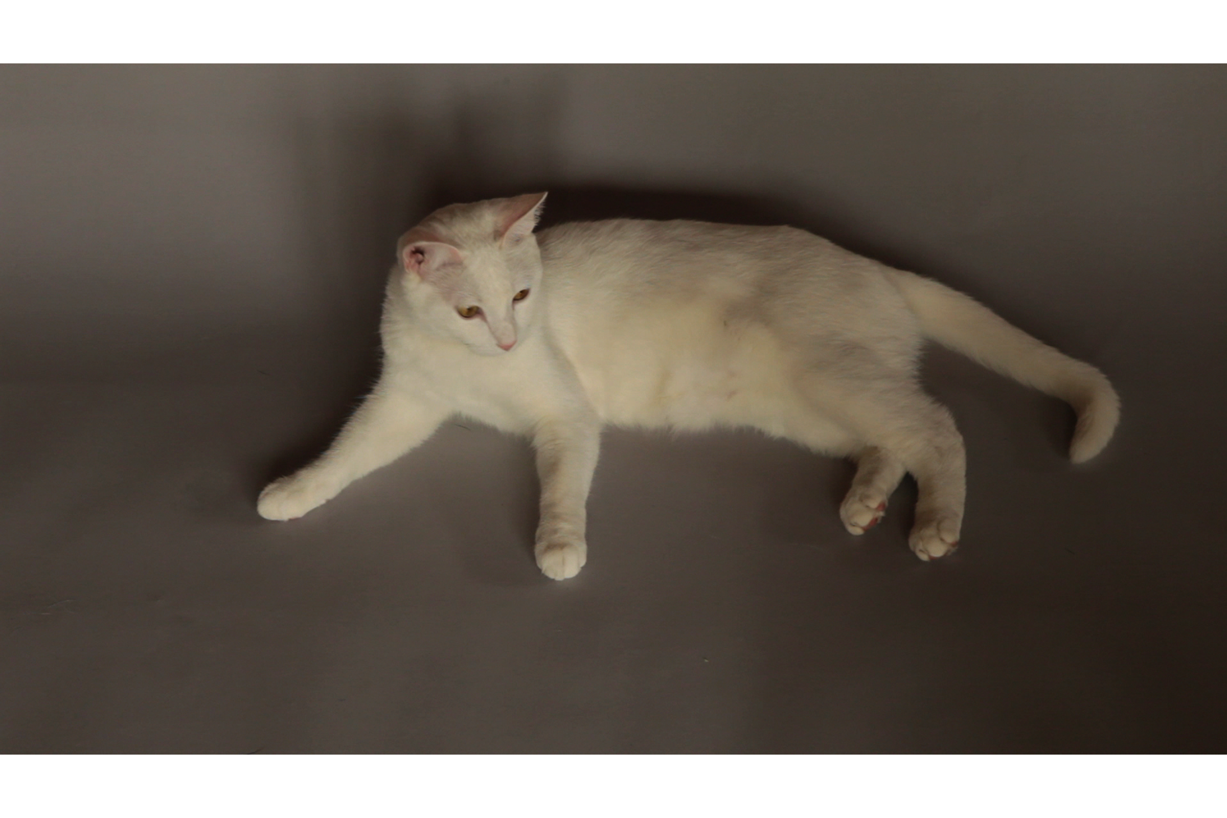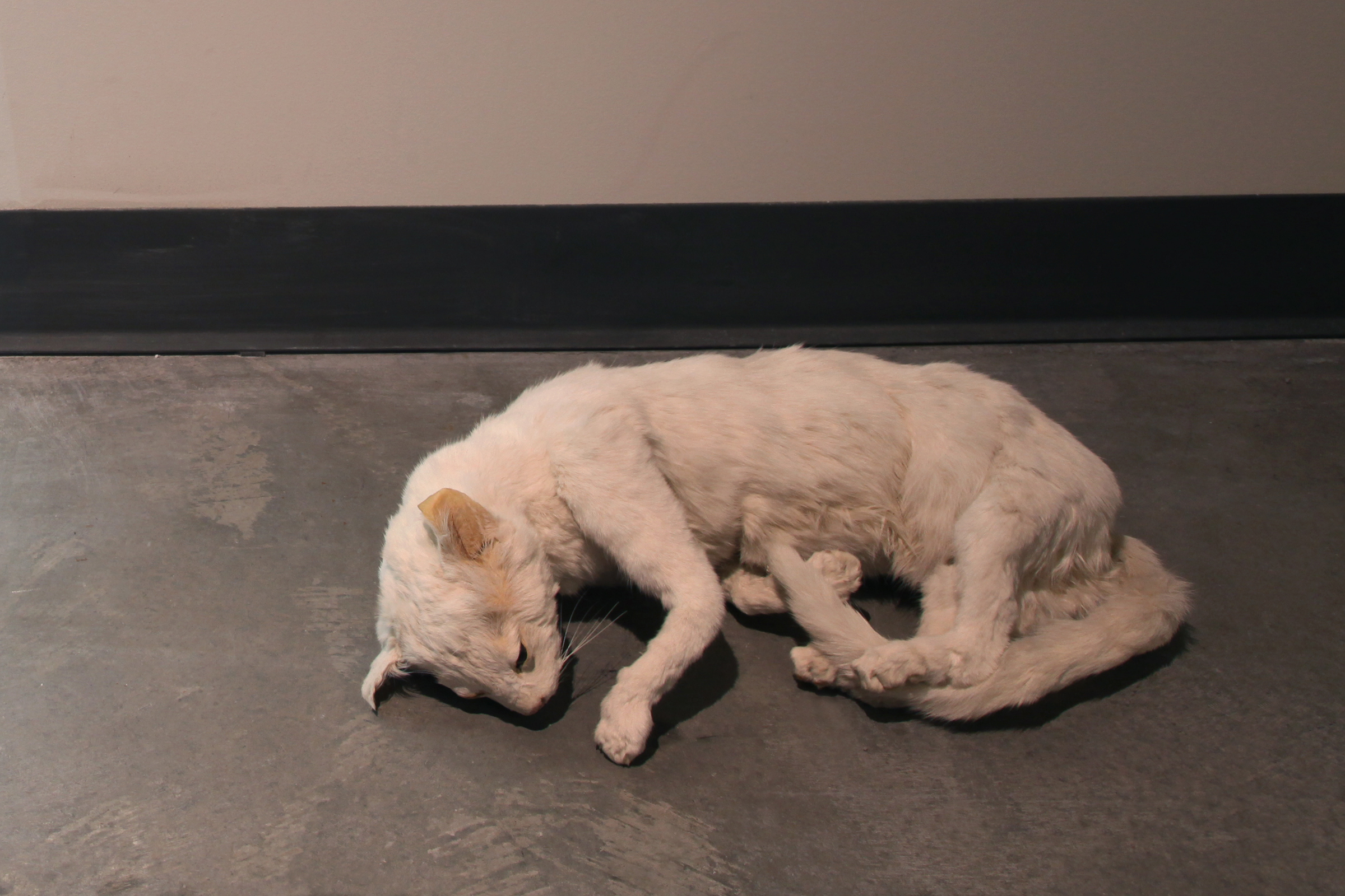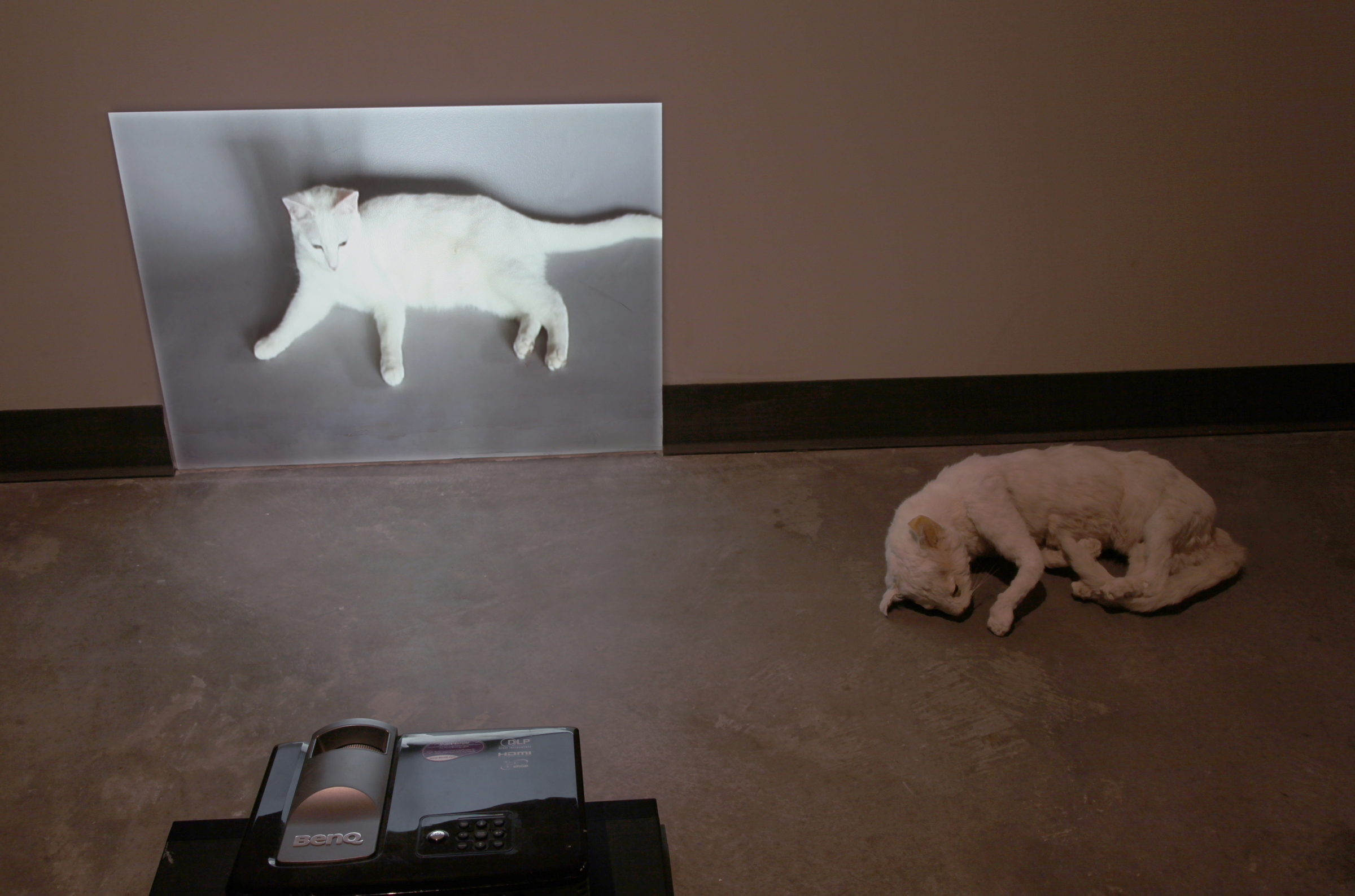 Where Do They Go? includes a stuffed cat (which at first glance appears to be an ordinary dead cat) redoubled with a video of a live cat (in its exact likeness). The staging of the projection apparatus is key to this doubling effect – the stuffed cat, projection, and projector all being presented at floor level. The title is taken from the movie Temple Grandin, in which Temple contemplates where cows go when they die.